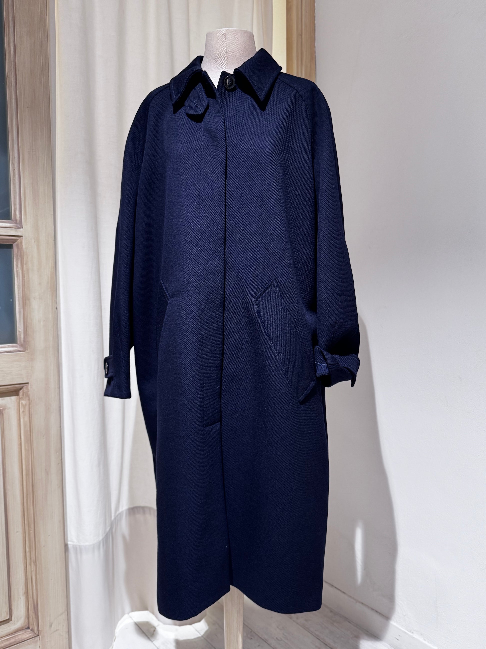 Vestibilità dritta e spalle larghe - Lunghezza al ginocchio - Ampio colletto classico con abbottonatura decentrata - Chiusura frontale con bottoni nascosti - Due tasche a filetto sul davanti - Dettaglio spacco sul giromanica - Interno foderato - Cordoncino in lana vergine.