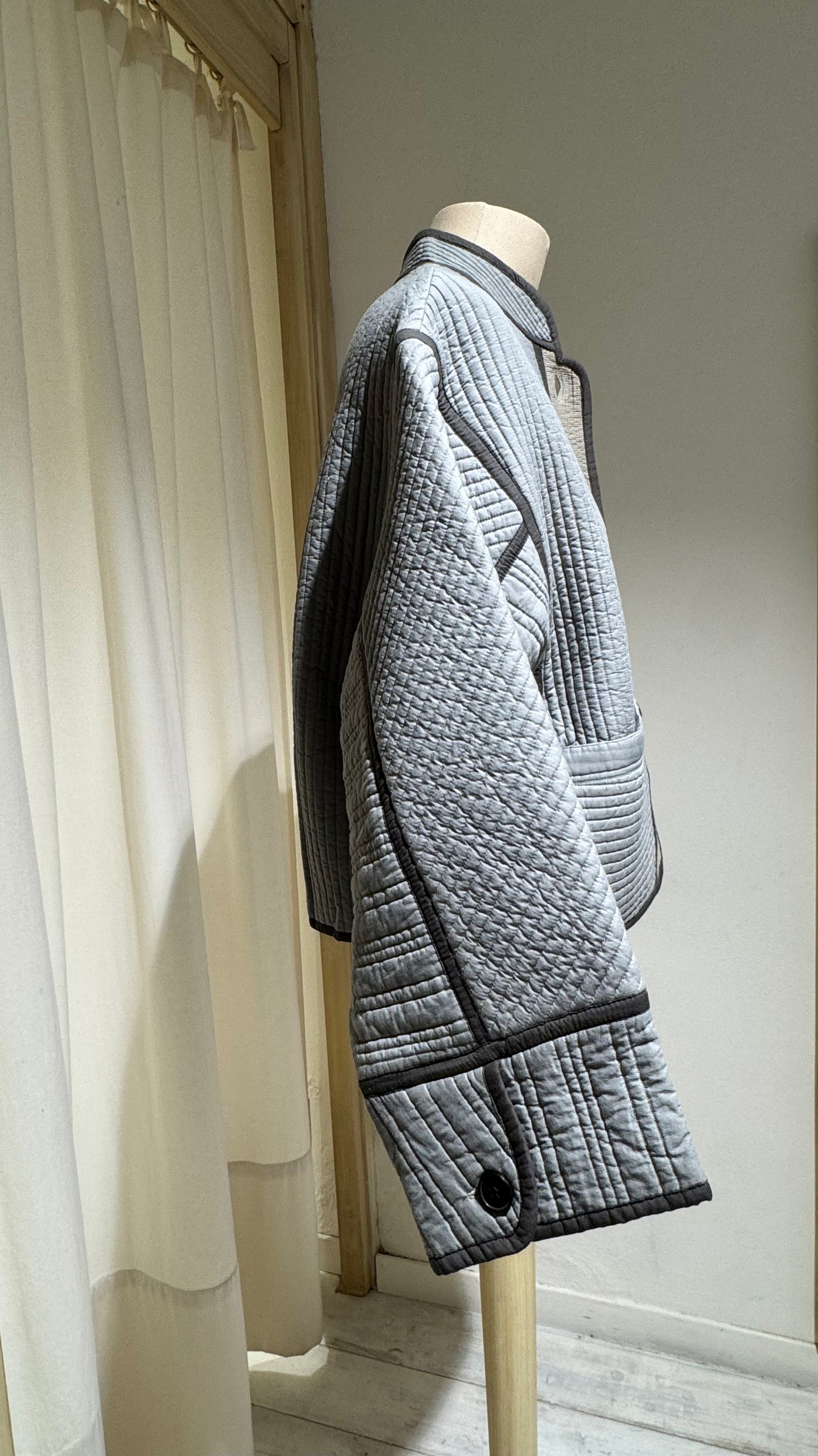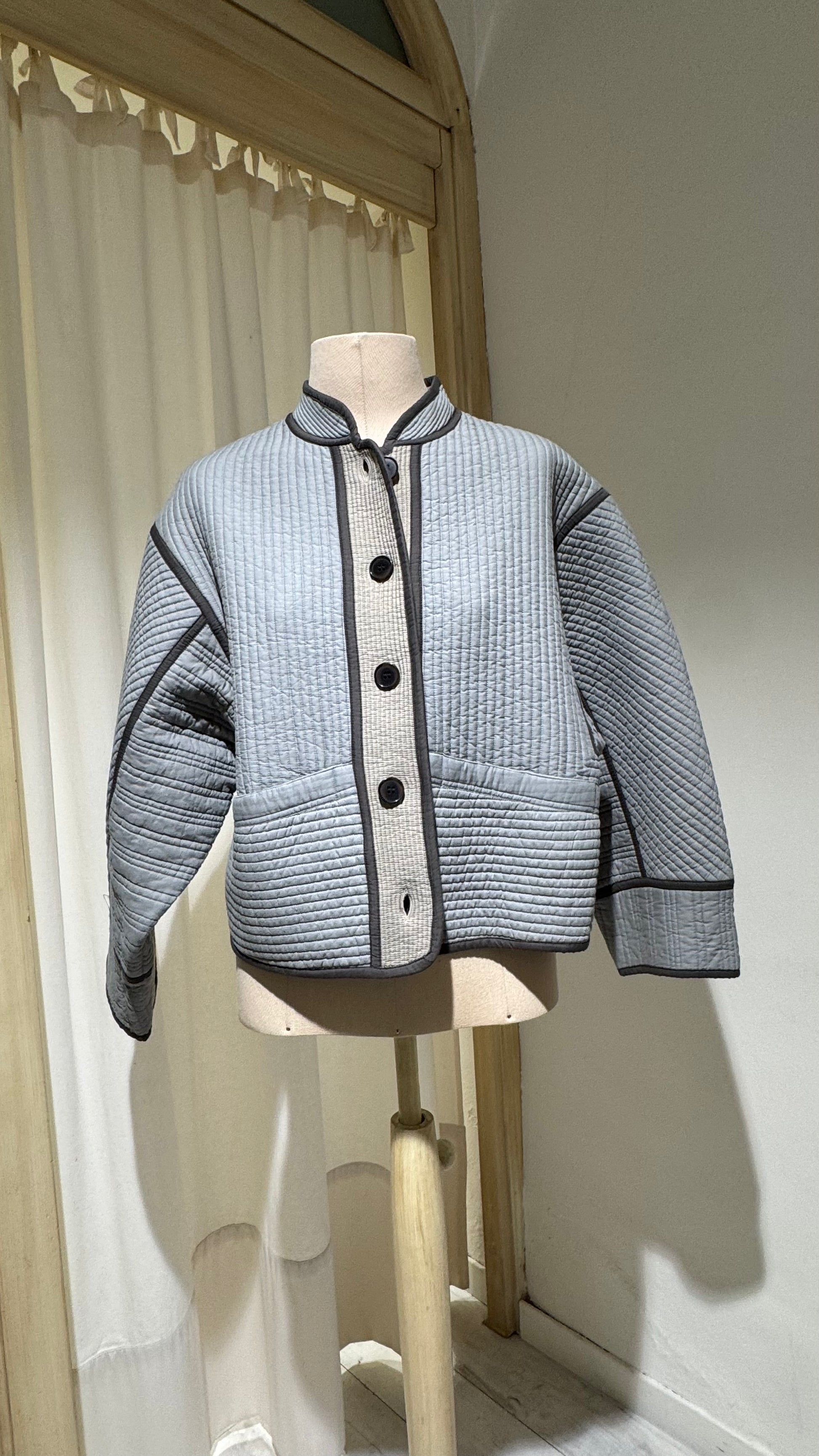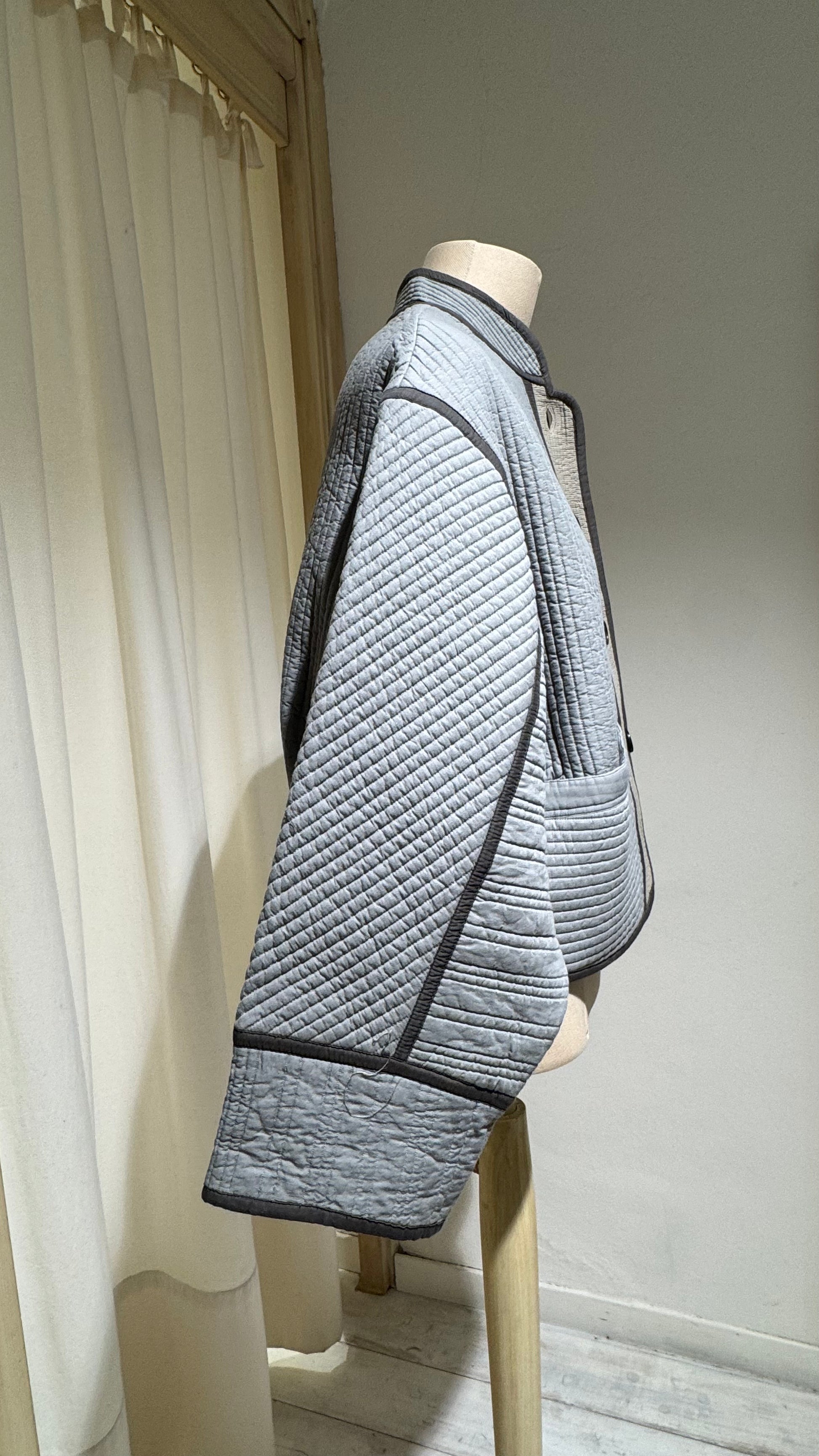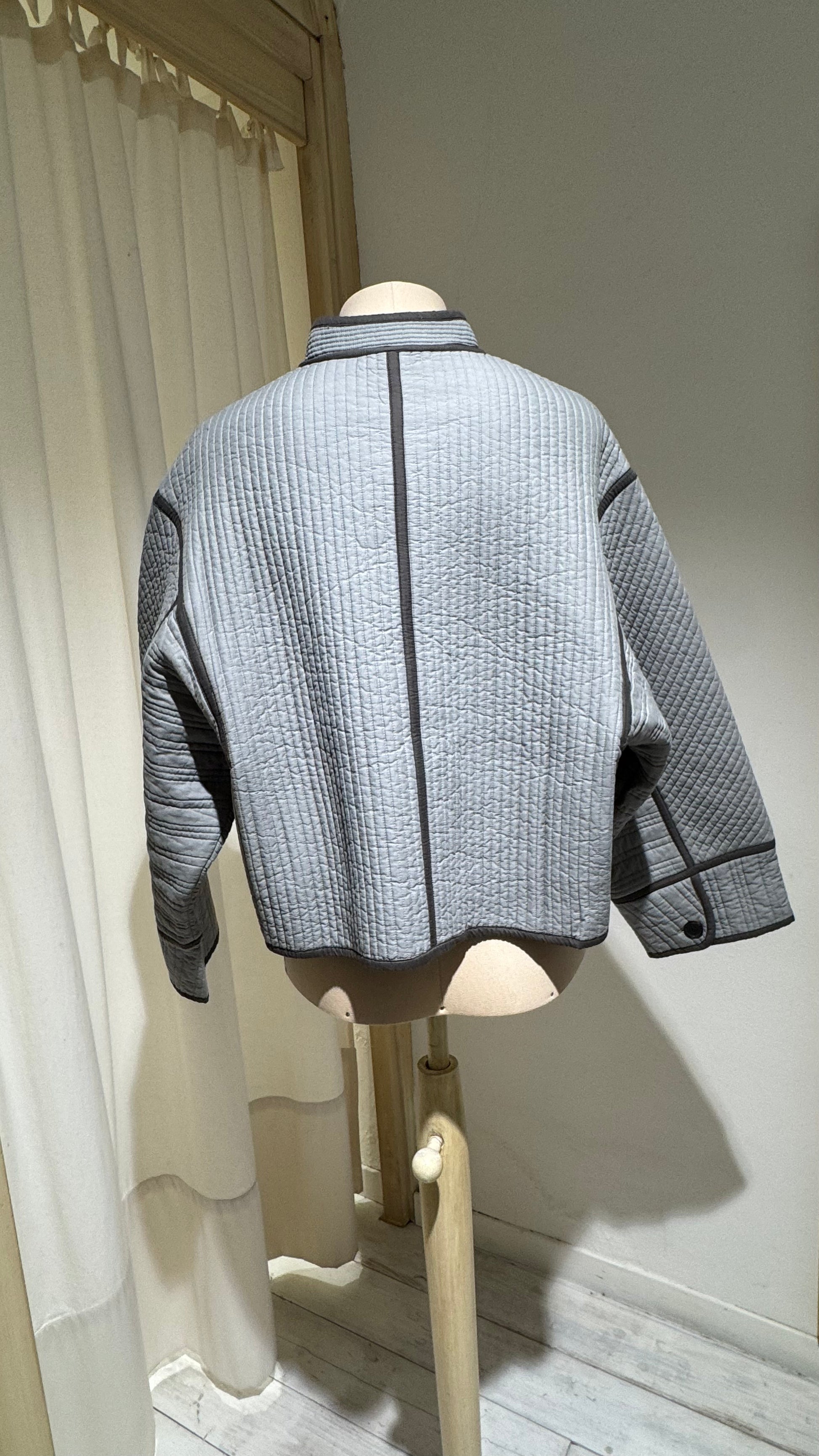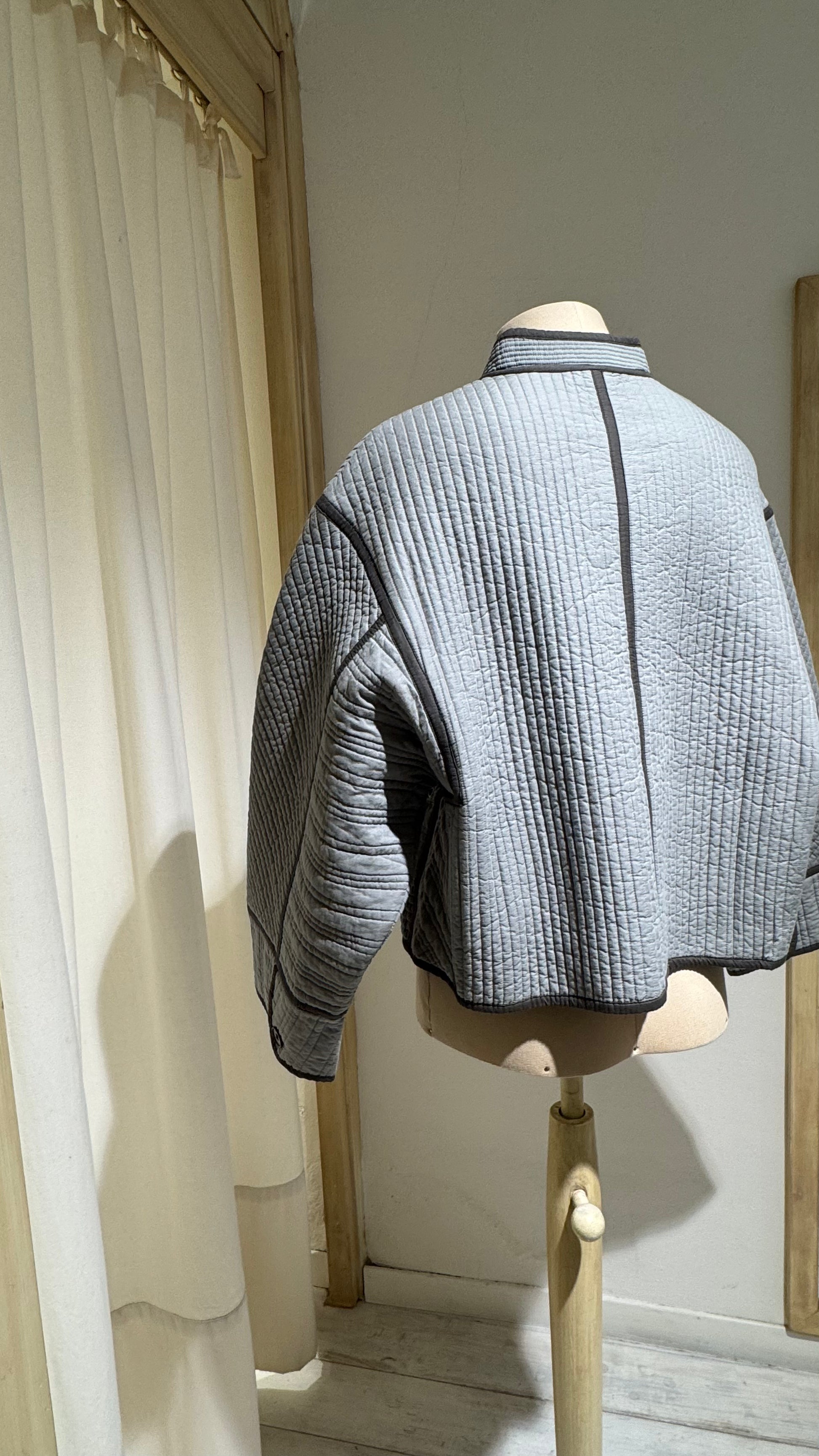 Cropped jacket with a loose, rounded shape Long sleeves High collar and front buttoning Button placket Front welt pockets Boutis quilting and piping finishes