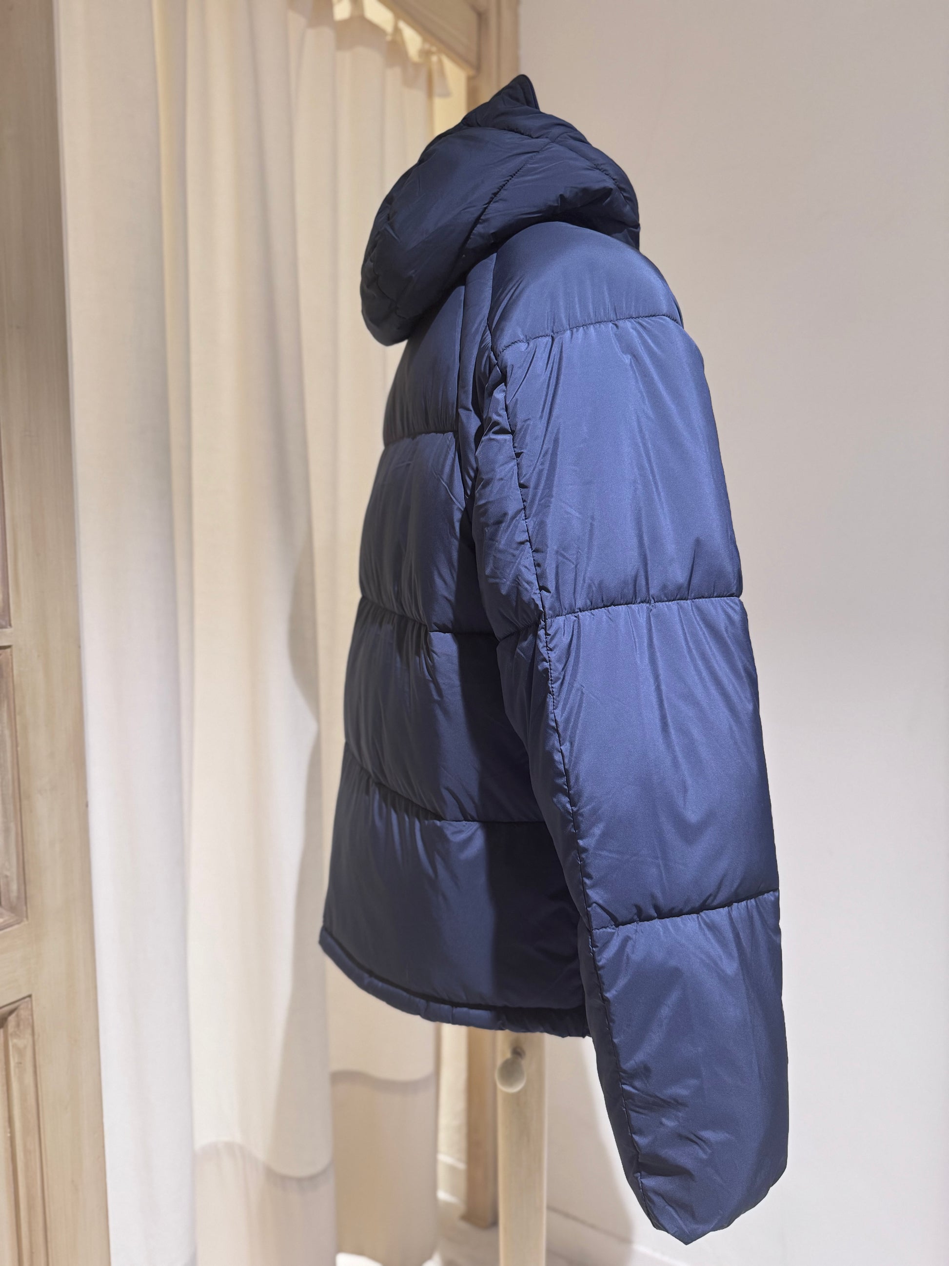 Piumino Parka con cappuccio, doppia tasca centrale, tasche interne, coulisse sul fondo.