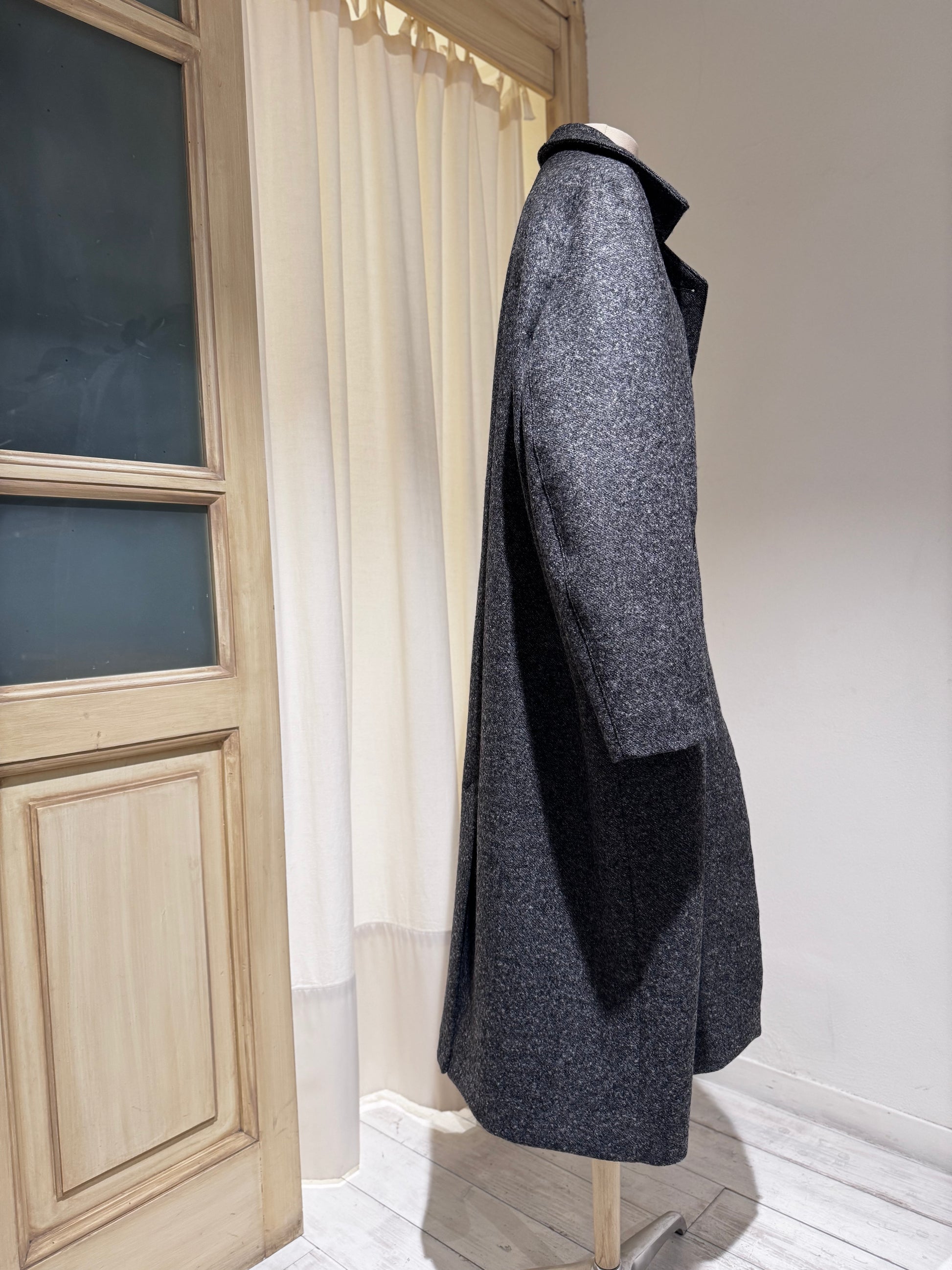GERMAIN è un cappotto lungo in lana grigio mélange, taglio dritto e collo alto. Chiusura a due bottoni, tasche con filetto, look maschile. Lana doppio mélange e fodera per calore, bottone spostato per dettaglio couture.