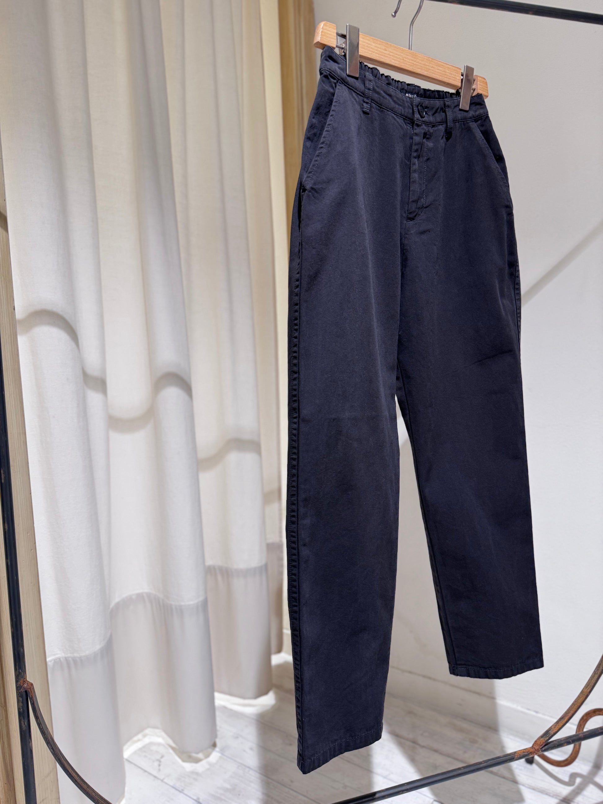 Slim-fit cotton trousers with an elastic waistband, side pockets, and two back flap pockets.