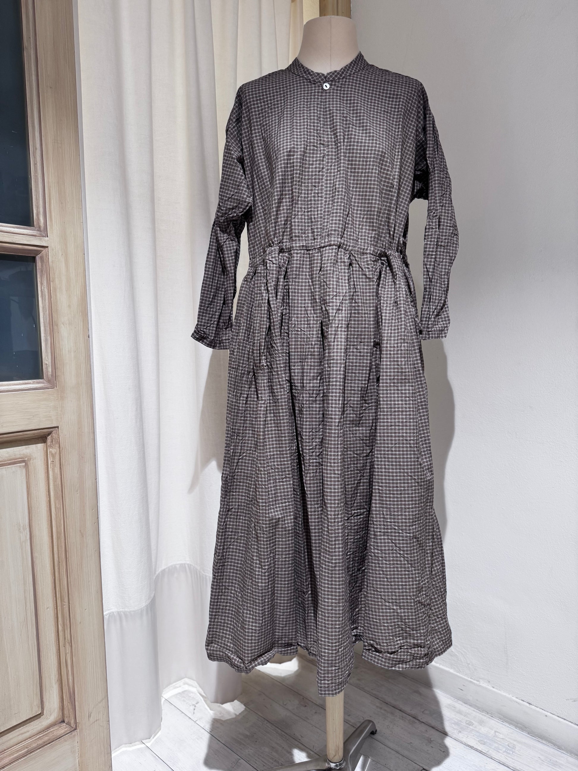 Long-sleeved dress with a Guru collar, single-button closure, drawstring waist, and side pockets.