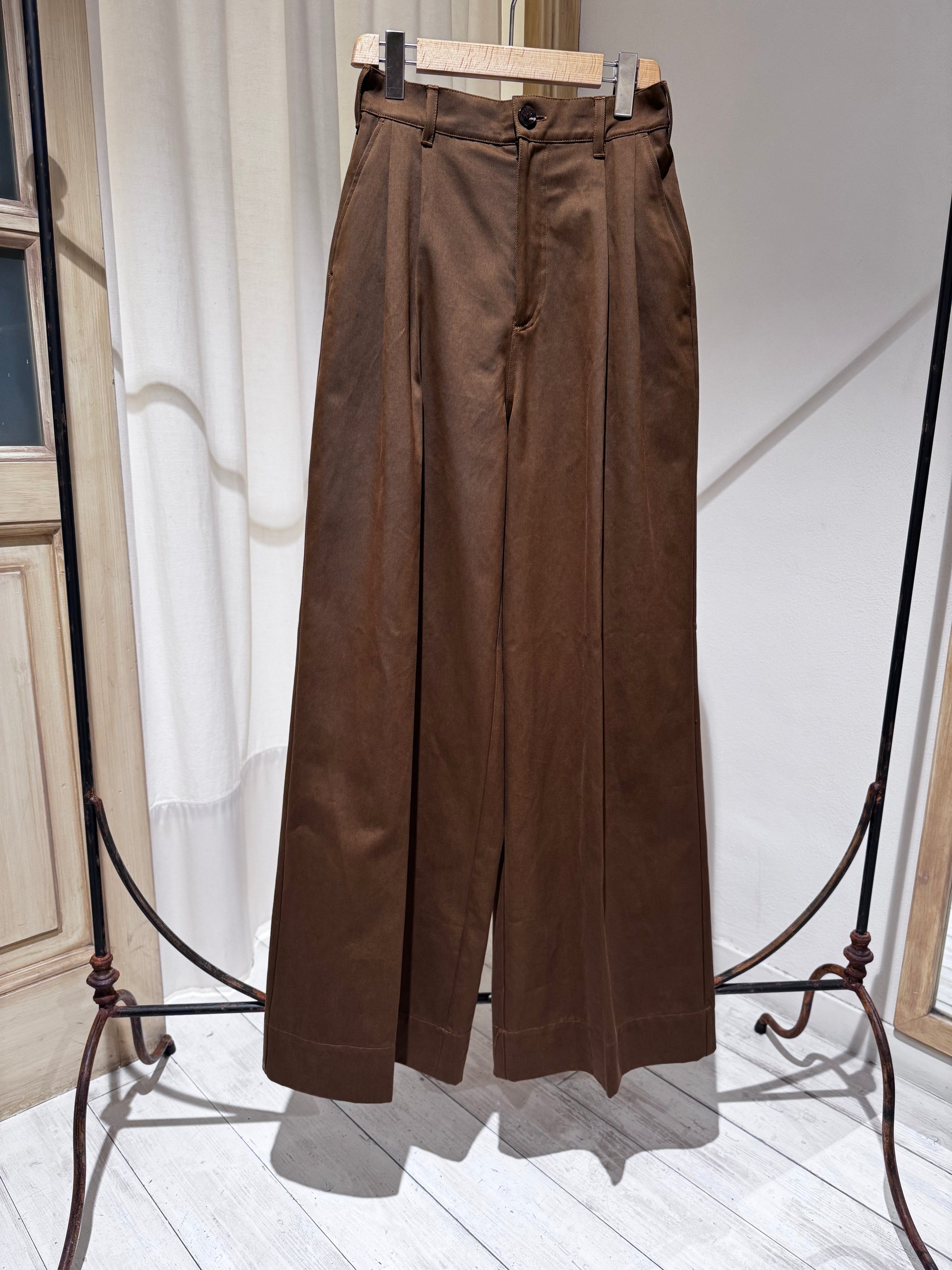 Vita aderente e gambe larghe, Vita elasticizzata sul retro, Apertura con bottoni e zip, Due tasche all'italiana davanti e due tasche a filetto sul retro, Pieghe marcate lungo la gamba davanti e dietro, Twill di cotone spesso