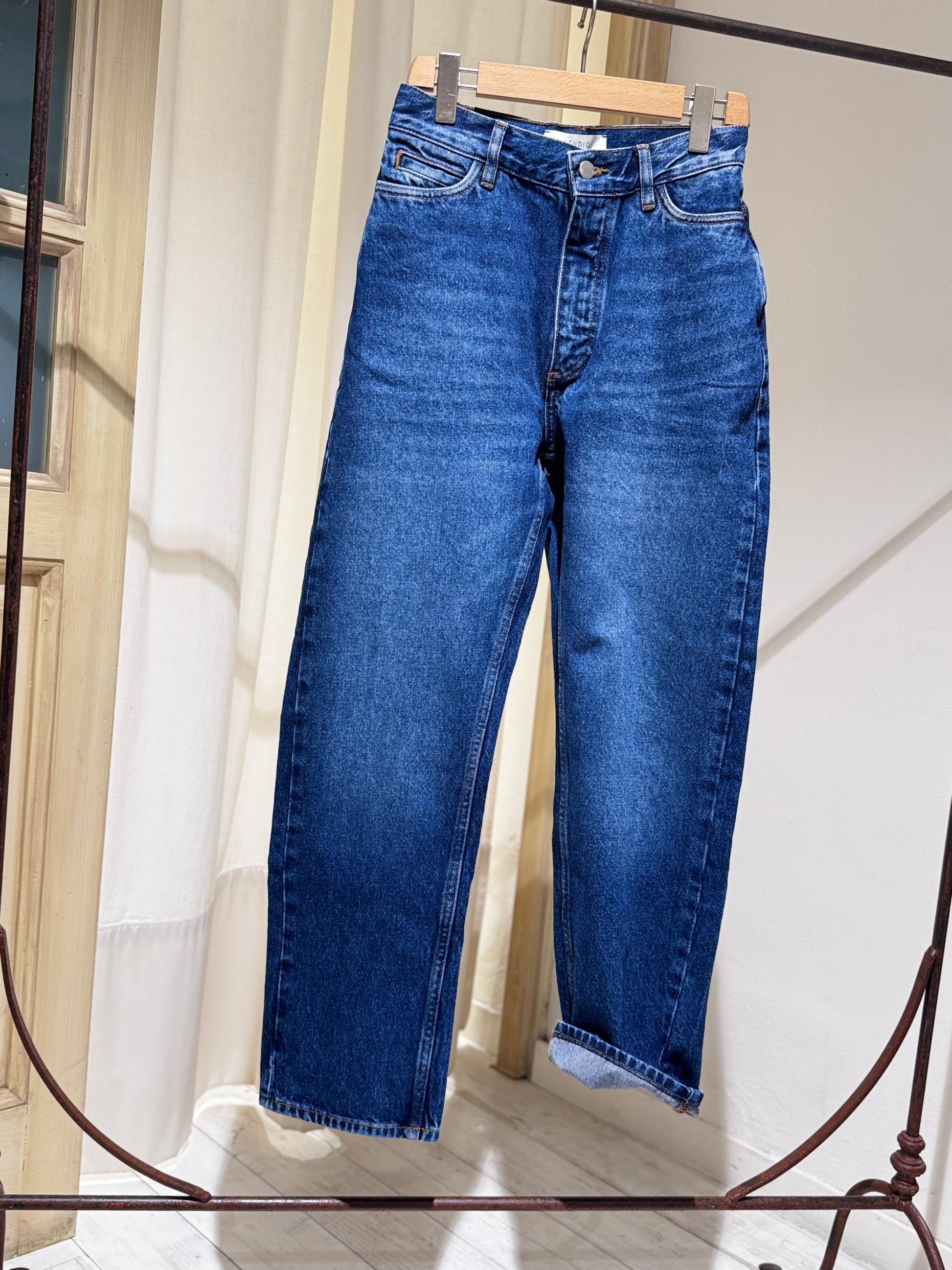 A true SN classic, Ruthe takes a high-waisted denim style and adds a curved shape through the leg. This version is constructed from a denim that’s been woven from regenerative cotton in a washed-indigo shade, lending a worn-in note of laidback familiarity. Made from 14oz washed denim, it offers a heavier, more traditional feel.